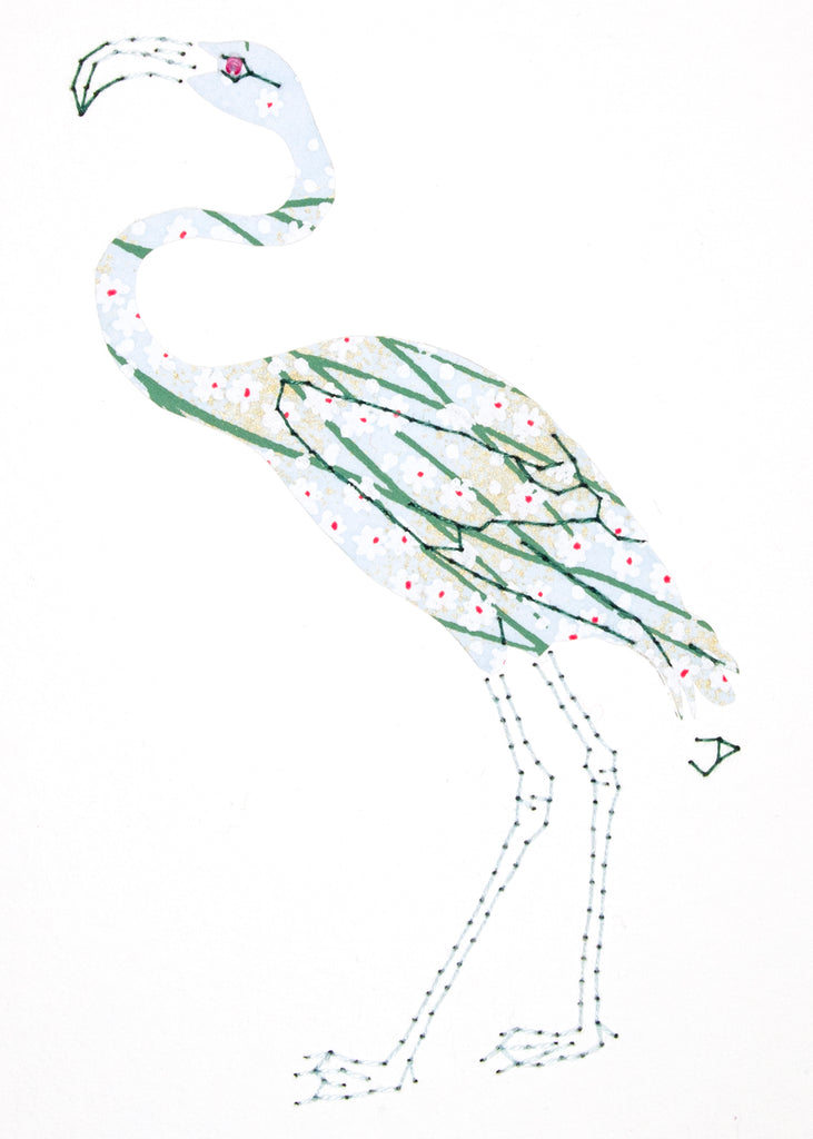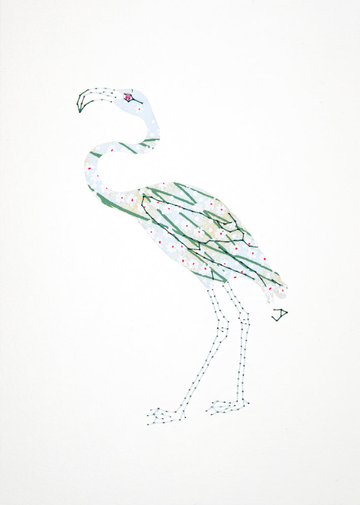 The flamingo is 4.75 inches tall, stitched by hand on 5x7 inch 100% cotton watercolour paper, which means that it will pop right into any commercial frame in that size, and be ready to hang on your wall.