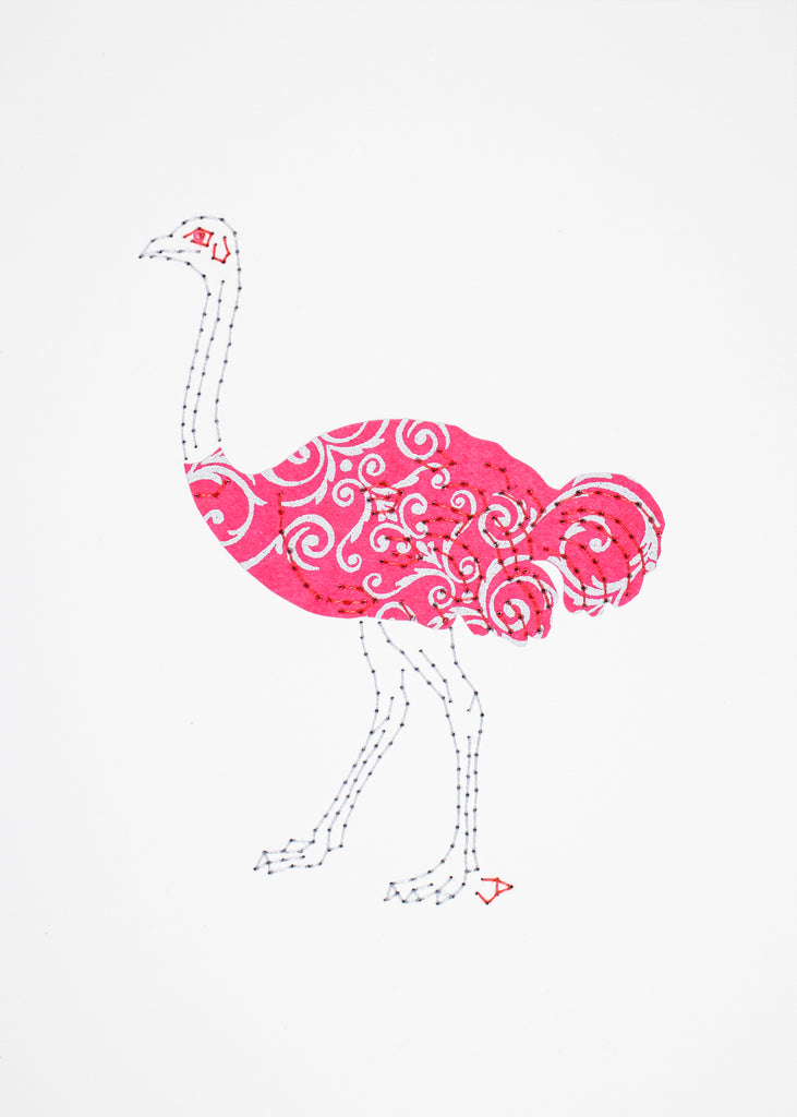 My ostrich is 4.24 inches tall, stitched by hand on 5x7 inch 100% cotton watercolour paper, which means that it will pop right into any commercial frame in that size, and be ready to hang on your wall.