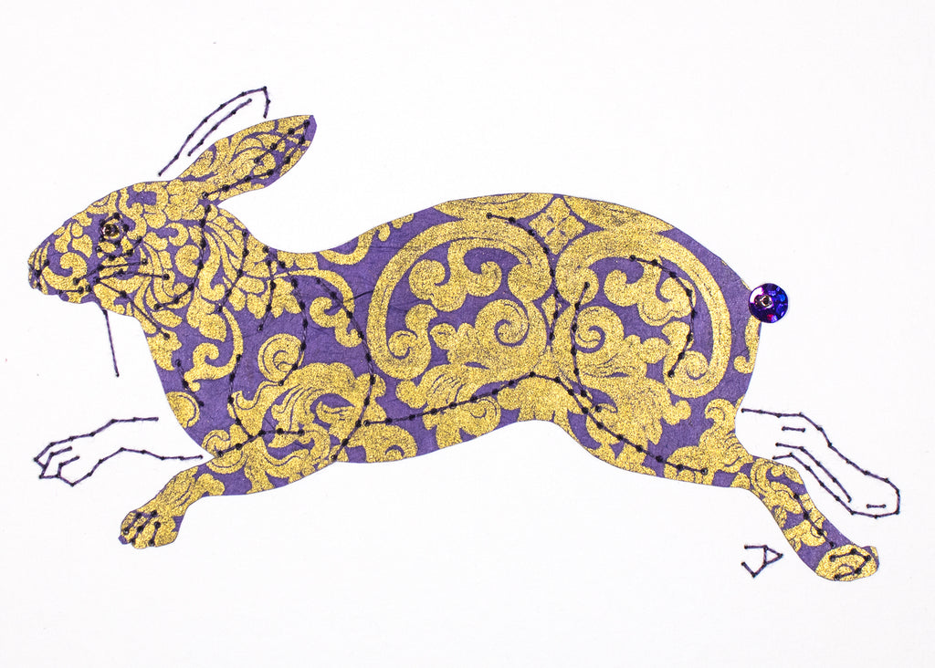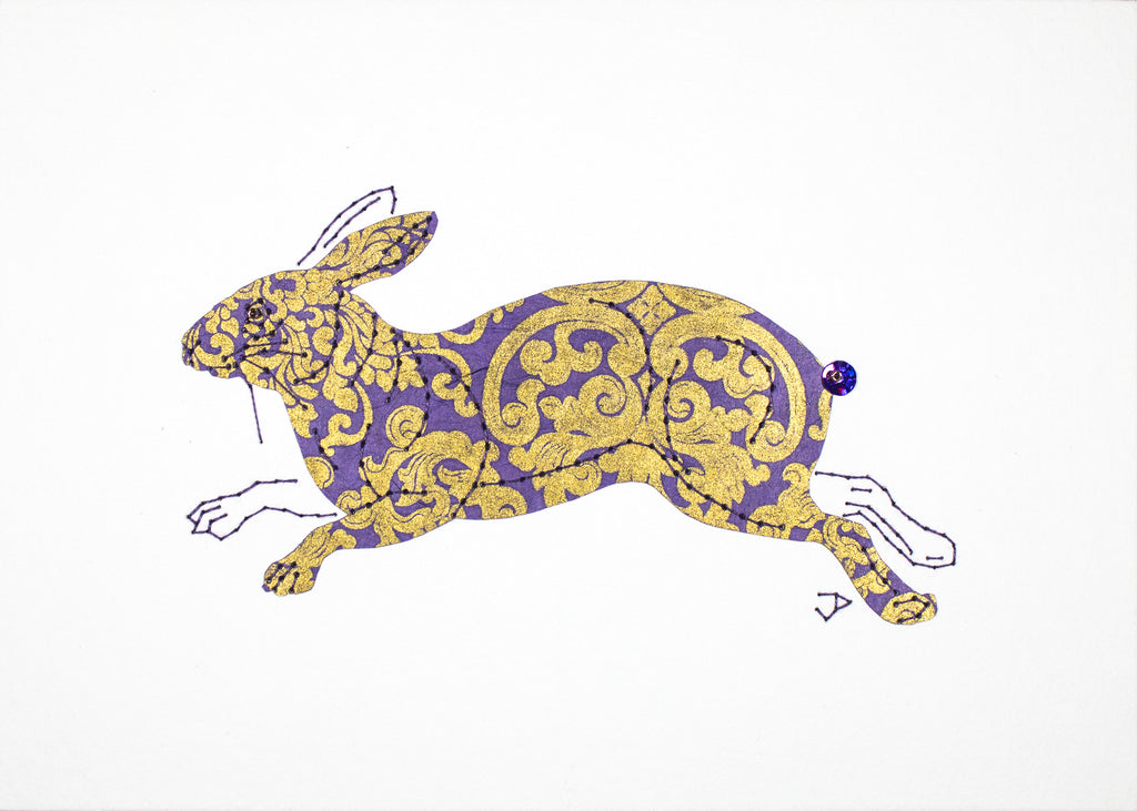 The rabbit is 4.75 inches wide, stitched by hand on 5x7 inch 100% cotton watercolour paper, which means that it will pop right into any commercial frame in that size, and be ready to hang on your wall.